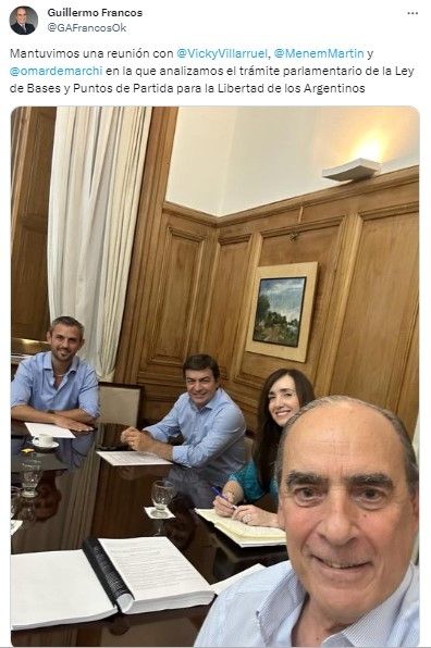 Sobre el encuentro, Francos compartió una foto en su red social y agregó: "Mantuvimos una reunión con Victoria Villarruel, Martín Menem y Omar de Marchi en la que analizamos el trámite parlamentario de la Ley de Bases y Puntos de Partida para la Libertad de los Argentinos".