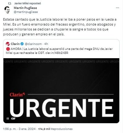 "Estaba cantado que la Justicia laboral le iba a poner palos en la rueda a Milei. Es un fuero enamorado del fracaso argentino, donde abogados y jueces millonarios se dedican a chuparle la sangre a todos los que producen y generan empleo en el país", escribió Pugliese y que Milei apoyó.