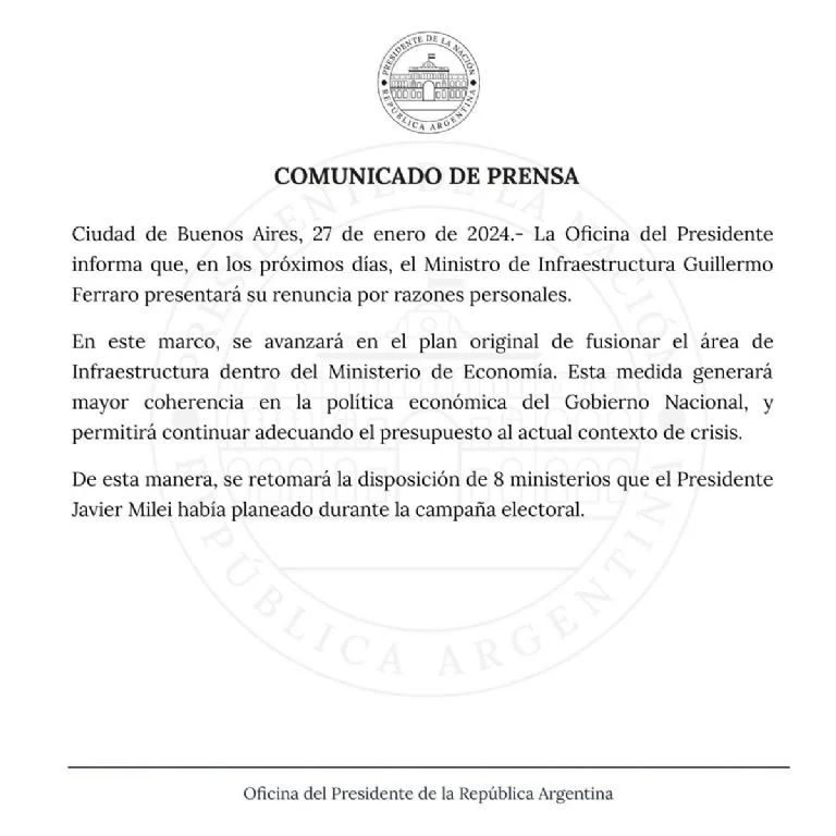 Este sábado, y ya sabiéndose que Infraestructura pasará a la órbita del ministerio de Economía comandado por Luis Caputo, el Gobierno emitió un comunicado donde informó que "en los próximos días" el ministro "Guillermo Ferraro presentará su renuncia".