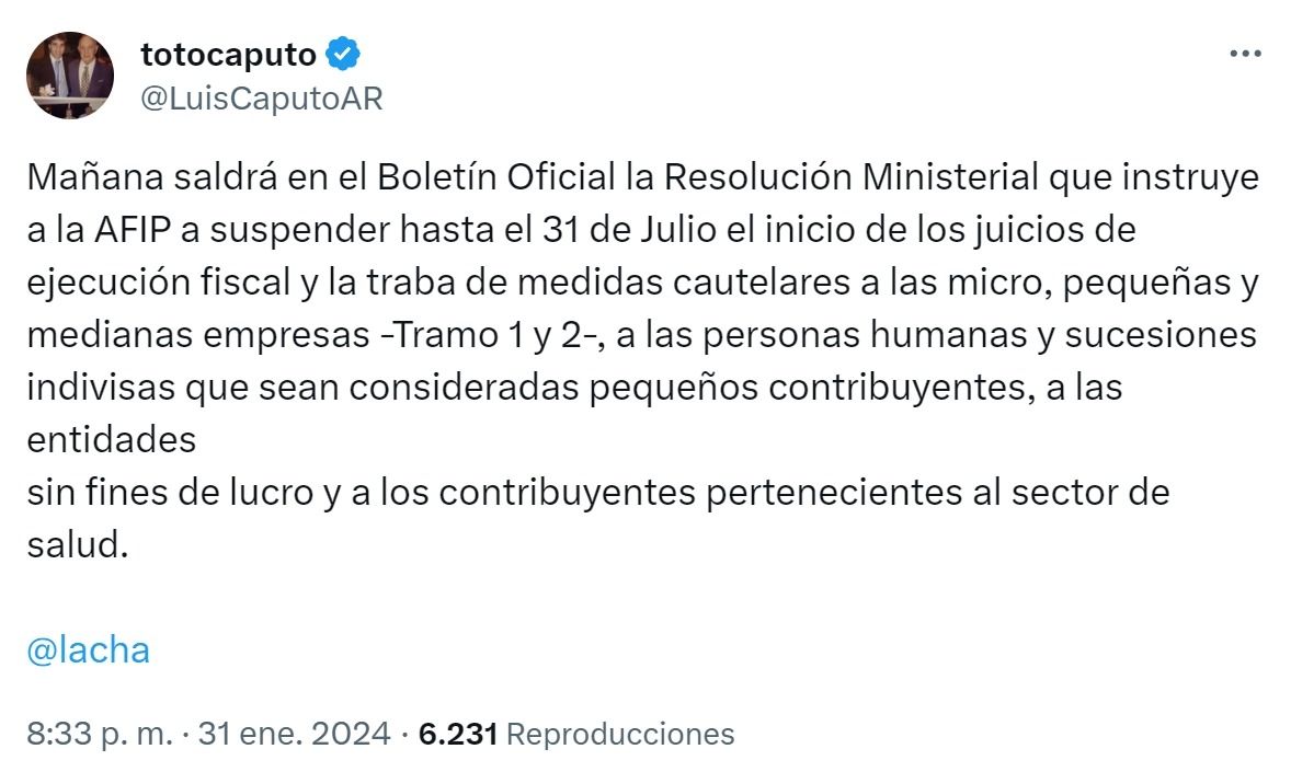 Oficial: Luis Caputo ordenó a la AFIP suspender embargos y juicios a deudores
