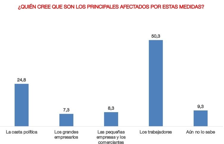 En alusión a quienes serían los principales beneficiados por las medidas, un 35,5 por ciento consideró que serán los grandes empresarios, quedando atrás la opción "los trabajadores" con un 21,2%.