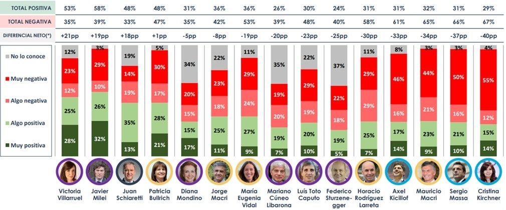 En segundo lugar aparece la vicepresidenta, Victoria Villarruel, con 53 puntos a favor y 35 en contra. En tercer lugar, aparecen empatados una figura de peso del Gabinete Nacional con un sorpresivo dirigente: se tratan de Patricia Bullrich y Juan Schiaretti, igualados en 48 puntos.