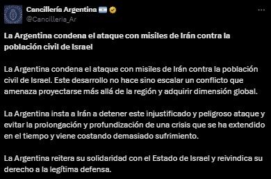 "La Argentina condena el ataque con misiles de Irán contra la población civil de Israel. Este desarrollo no hace sino escalar un conflicto que amenaza proyectarse más allá de la región y adquirir dimensión global", señaló la Cancillería a través de un comunicado.