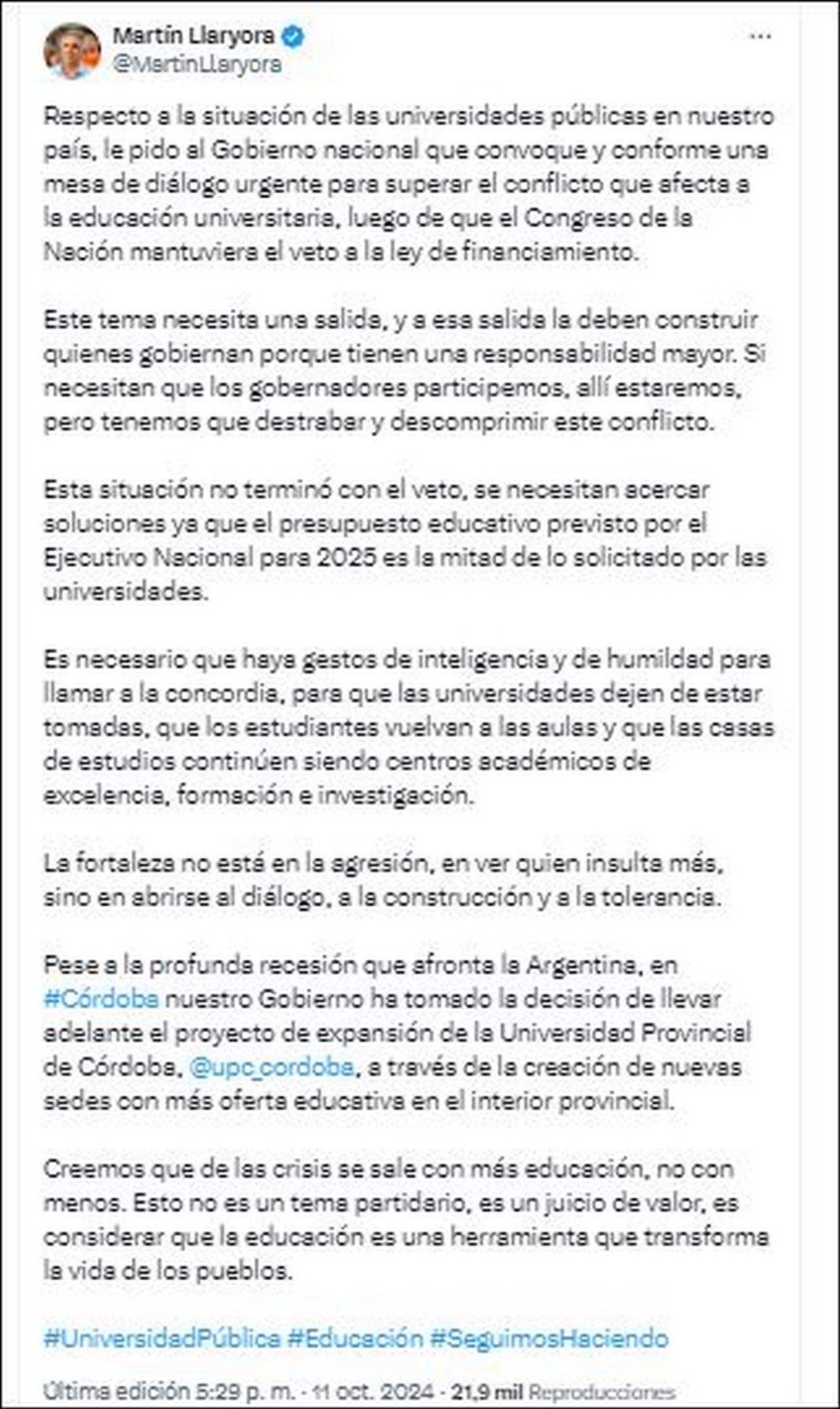 "Le pido al Gobierno nacional que convoque a una mesa de diálogo urgente para superar el conflicto universitario, luego de que el Congreso ratificara el veto a la ley de financiamiento", expresó Llaryora a través de sus redes sociales.