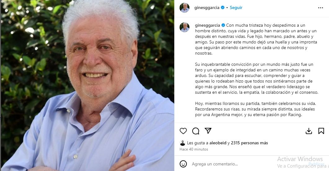 La noticia fue confirmada minutos antes de las 13 por el entorno del médico cirujano a través de un comunicado publicado en su cuenta de Instagram. "Con mucha tristeza hoy despedimos a un hombre distinto, cuya vida y legado han marcado un antes y un después en nuestras vidas. Fue hijo, hermano, padre, abuelo y amigo. Su paso por este mundo dejó una huella y una impronta que seguirán abriendo caminos en cada uno de nosotros y nosotras", inicia el posteo .
