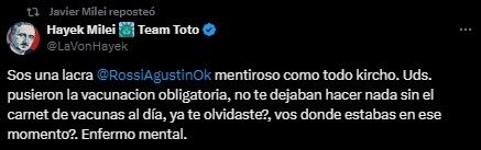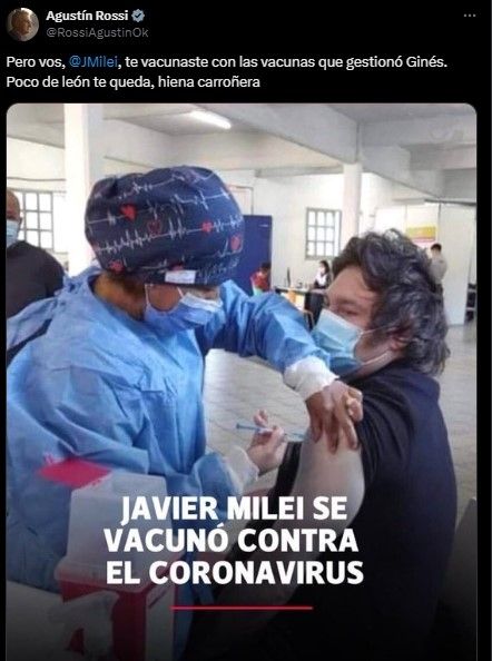 La publicación despertó la respuesta de Rossi, que subió a las redes una foto de Milei cuando se vacunó contra el coronavirus con vacunas que pagó el Estado.