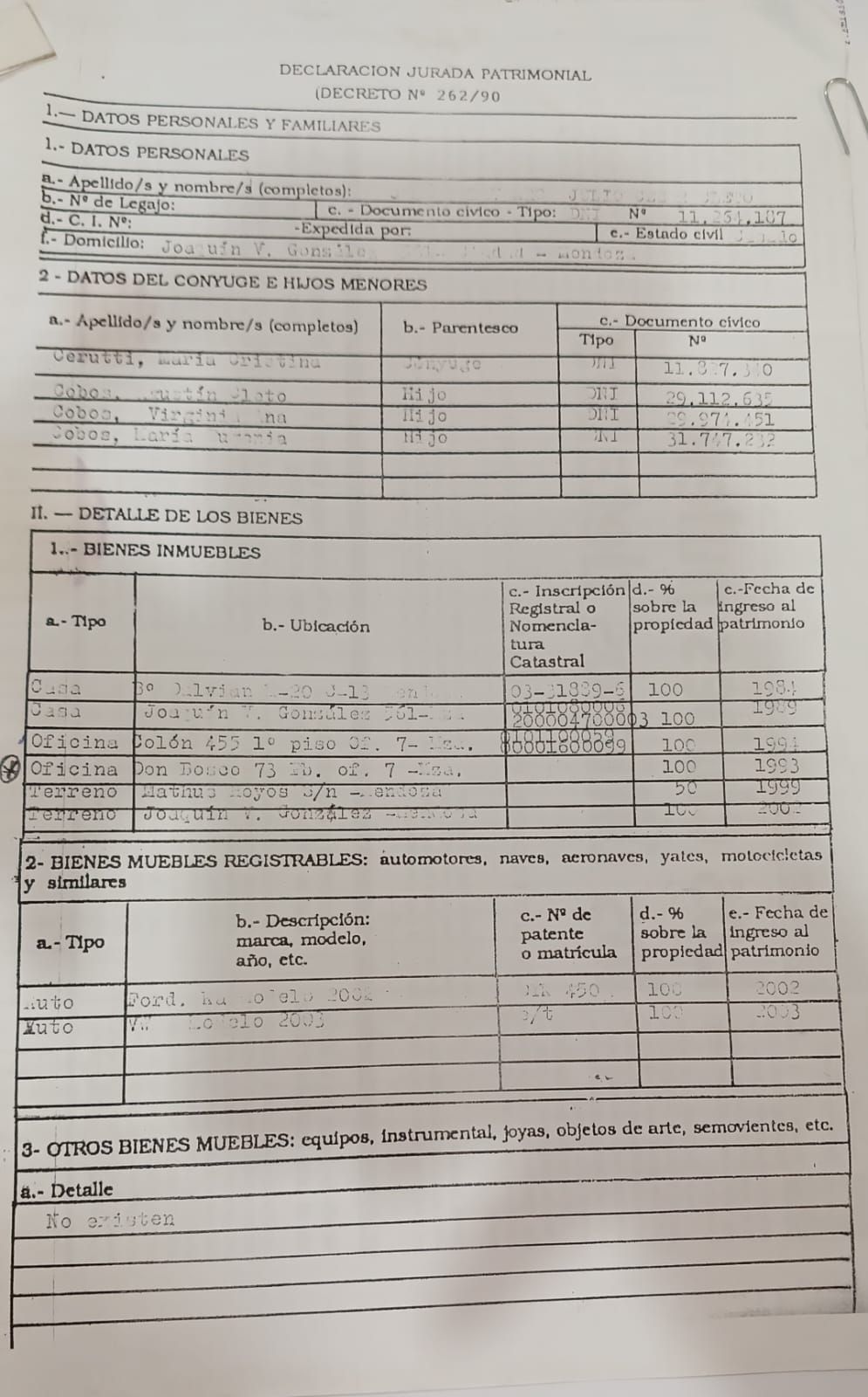 Julio Cobos tuvo un patrimonio oscilante. Siempre presentó su DDJJ, aún cuando no era obligatorio hacerla pública. Cobos abandonó hace tiempo la casa de la sexta sección en a que habitaba cuando fue mandatario y desde entonces ya tenía otros inmuebles, como una casa en Dalvian, dos oficinas en calle Colón y dos terrenos (en carril Mathus Hoyos y otro en JV. González). El exgobernador fue vicepresidente, senador y diputado nacional, cargo que ejerce. Cambió su situación familiar y es uno de los pocos legisladores mendocinos que tiene su Declaración Jurada actualizada al 2023. Allí declara bienes y dinero por 9.098.927 pesos, aunque tiene ingresos por más de 63 millones anuales, provenientes de su dieta y la pensión que recibe como exvicepresidente (él asegura que dona esos ingresos). Como bienes, mantiene uno de sus antiguos departamentos y sumó un inmueble en Luján, de más de 600 m2.