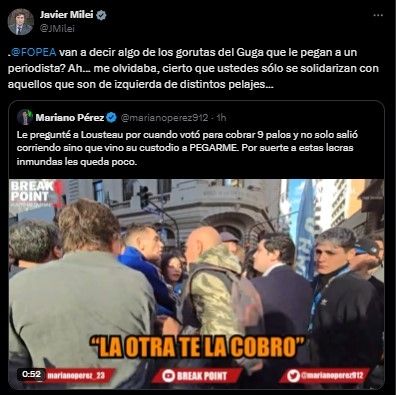 Milei se hizo eco de la situación y apuntó duramente contra Lousteau. Además, mencionó al inicio de su descargo al Foro de Periodismo Argentino (FOPEA) a modo de llamado de atención por el hecho.