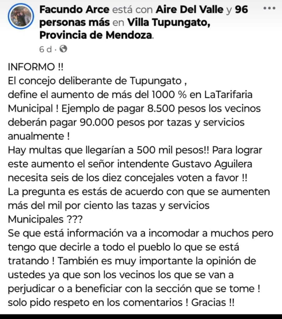 El concejal Facundo Arce, quien preside el bloque Partido Federal, abrió el debate en sus redes sociales. "El Concejo Deliberante de Tupungato ,define el aumento de más del 1000 % en laTarifaria Municipal ! Ejemplo de pagar 8.500 pesos los vecinos deberán pagar 90.000 pesos por tasas y servicios anualmente. Hay multas que llegarían a 500 mil pesos!! Para lograr este aumento el señor intendente Gustavo Aguilera necesita seis de los diez concejales voten a favor", sostuvo en Facebook. Recibió muchos comentarios en contra de la propuesta por parte de quienes respondieron a su posteo.