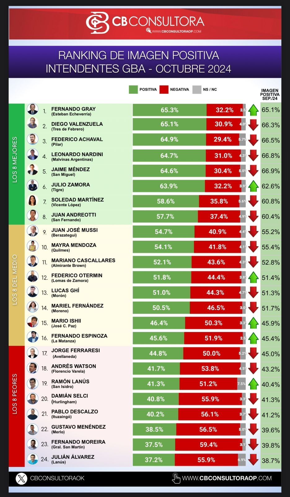 El segundo con mayor imagen positiva fue Diego Valenzuela de Tres de Febrero, con 65,1%, y luego Federico Achával, de Pilar, con 64,9%, quien suele mantenerse en el tercer lugar. Entre tanto, el que más creció comparado a la última medición fue Julio Zamora de Tigre (+1.3%), mientras que el que más decayó fue Juan Andreotti de San Fernando (-2.7%).