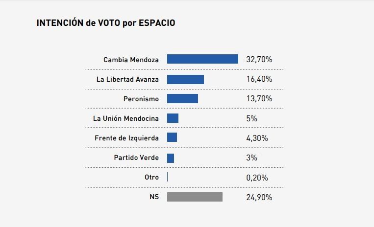 La última encuesta de Reale Dalla Torre confirma que aún existe un porcentaje elevado de indecisión. El 25% de los encuestados no tiene definida su intención de voto. En ese estudio, Cambia Mendoza conserva el 32,7% de apoyo seguido por La Libertad Avanza con el 16,4%. El peronismo vuelve a figurar tercero con el 13,7%.