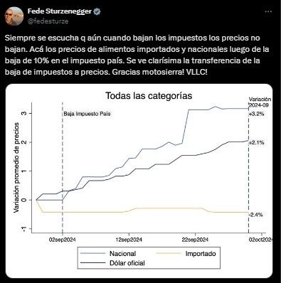 "Siempre se escucha que aún cuando bajan los impuestos los precios no bajan. Acá los precios de alimentos importados y nacionales luego de la baja de 10% en el impuesto país", escribió el funcionario en la red social X.