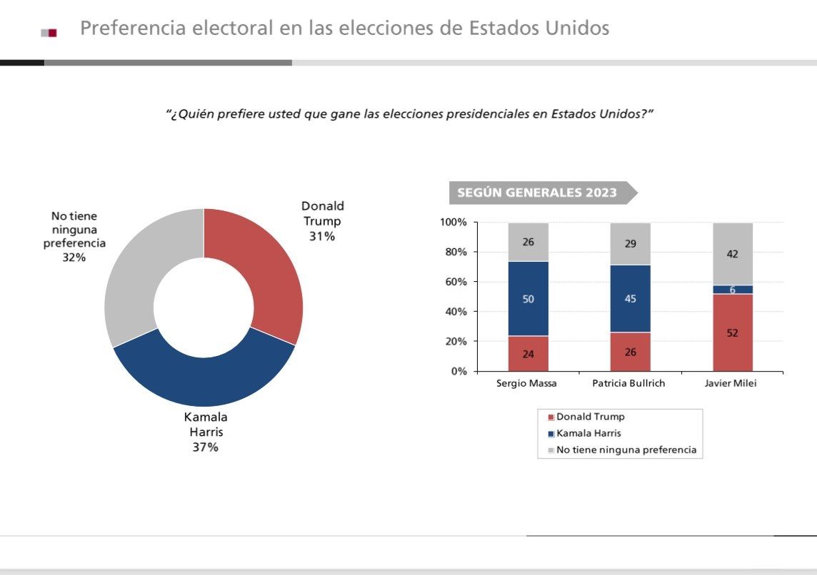 El estudio de la consultora que dirige Alejandro Catterberg indicó que el 37% de los encuestados tiene una preferencia por la actual vicepresidenta de Estados Unidos, Kamala Harris, mientras que el 31% se inclinaría por el exmandatario republicano Donald Trump. A la par, el número de desinteresados fue bastante alto: un 32% manifestó no tener preferencia alguna entre ambos candidatos.
