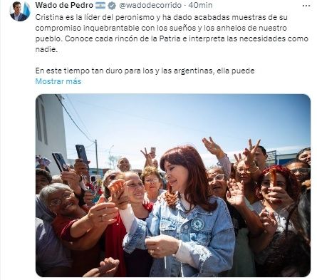"Cristina es la líder del peronismo y ha dado acabadas muestras de su compromiso inquebrantable con los sueños y los anhelos de nuestro pueblo. Conoce cada rincón de la Patria e interpreta las necesidades como nadie", señaló De Pedro.