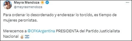 En tanto que la intendenta de Quilmes, Mayra Mendoza, también utilizó sus redes para pedir por Cristina como presidenta del PJ Nacional, "para ordenar lo desordenado y enderezar lo torcido, es tiempo de mujeres peronistas".