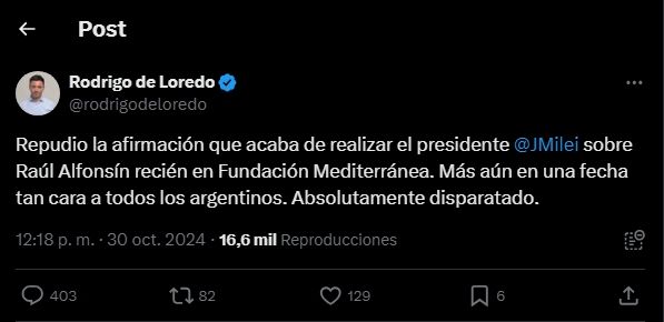 Uno de los primeros en pronunciarse fue el jefe de la bancada radical en Diputados, Rodrigo de Loredo, quien "repudió" los dichos de Milei "en una fecha tan cara a todos los argentinos". "Absolutamente disparatado", remarcó.
