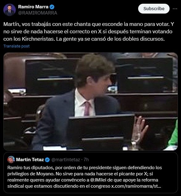 Inmediatamente, Tetaz apuntó contra el libertario y lo acusó de “defender los privilegios” del sindicalista “por orden del Presidente”. "Ramiro tus diputados, por orden de tu Presidente, siguen defendiendo los privilegios de Moyano. No sirve para nada hacerse el picante por X; si realmente querés ayudar, convéncelo a Javier Milei de que apoye la reforma sindical que estamos discutiendo en el Congreso”, escribió Tetaz.