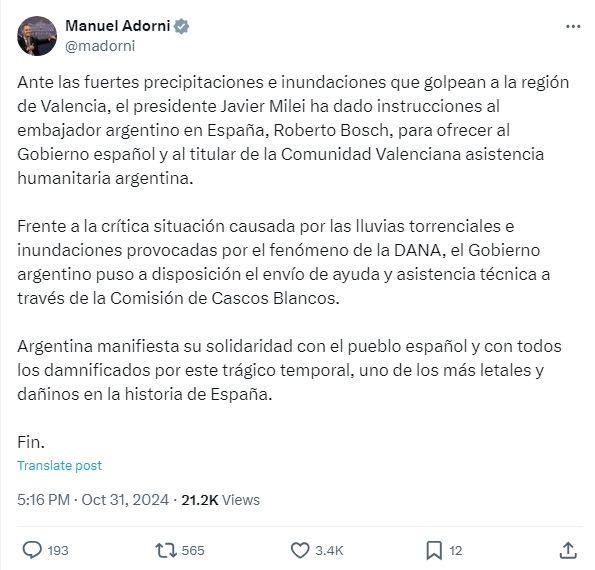 "Ante las fuertes precipitaciones e inundaciones que golpean a la región de Valencia, el presidente Javier Milei ha dado instrucciones al embajador argentino en España, Roberto Bosch, para ofrecer al Gobierno español y al titular de la Comunidad Valenciana asistencia humanitaria argentina", dijo Manuel Adorni desde sus redes sociales.