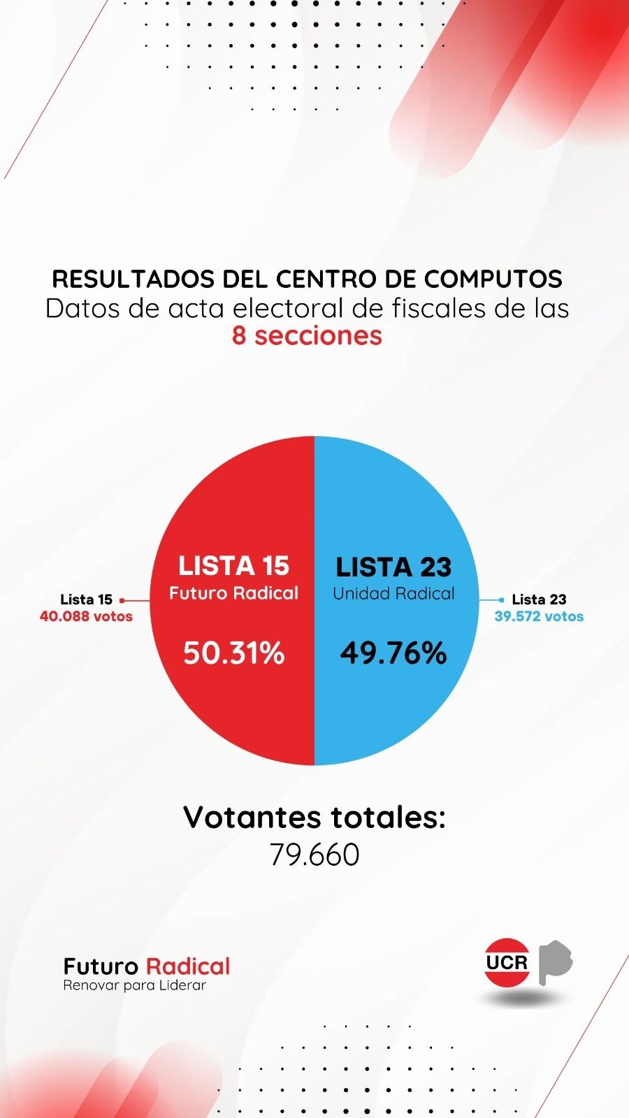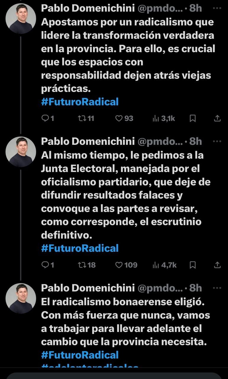 Pablo Domenichini, el candidato de “Futuro Radical”, respaldado por el senador nacional y presidente de la UCR Nacional Martín Lousteau y el diputado Facundo Manes, se adjudicó el triunfo por “un margen de 516 votos”, pidiéndole a “la Junta Electoral partidaria, manejada por el oficialismo, que deje de difundir resultados falaces y convoque a las partes revisar el escrutinio definitivo”.
