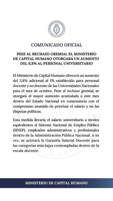 Tal como lo informó la cartera a cargo de Sandra Pettovello, se ofrecerá "un aumento del 5,8% adicional al 1% establecido para personal docente y no docente de las Universidades Nacionales para el mes de octubre".