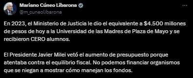 A través de un tuit, el funcionario sostuvo: "En 2023, el Ministerio de Justicia le dio el equivalente a $4.500 millones de pesos de hoy a la Universidad de las Madres de Plaza de Mayo y se recibieron CERO alumnos. El Presidente Javier Milei vetó el aumento de presupuesto porque atentaba contra el equilibrio fiscal".