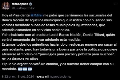 "Hoy el presidente Javier Milei me pidió que cerráramos las sucursales del Banco Nación de aquellos municipios que insisten con abusar de sus vecinos mediante subas de tasas municipales injustificadas, que además esconden en servicios nacionales", escribió el funcionario en su cuenta de X.