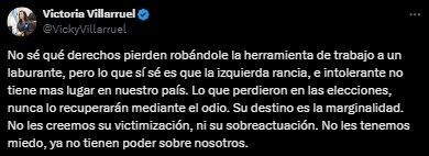 "No sé qué derechos pierden robándole la herramienta de trabajo a un laburante, pero lo que sí sé es que la izquierda rancia, e intolerante no tiene mas lugar en nuestro país", apuntó en un mensaje que compartió en la red social X.
