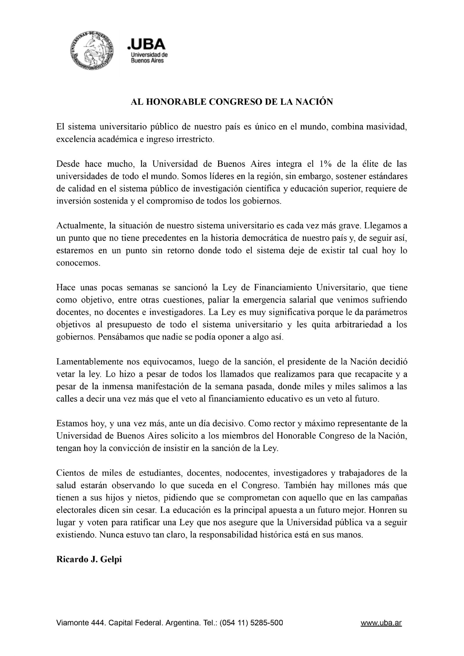 "Cientos de miles de estudiantes, docentes, no docentes, investigadores y trabajadores de la salud estarán observando lo que suceda en el Congreso. También hay millones más que tienen a sus hijos y nietos, pidiendo que se comprometan con aquello que en las campañas electorales dicen sin cesar", manifestó Gelpi, y enfatizó: "La educación es la principal apuesta a un futuro mejor. Honren su lugar y voten para ratificar una Ley que nos asegure que la Universidad pública va a seguir existiendo. Nunca estuvo tan claro, la responsabilidad histórica esta en sus manos".