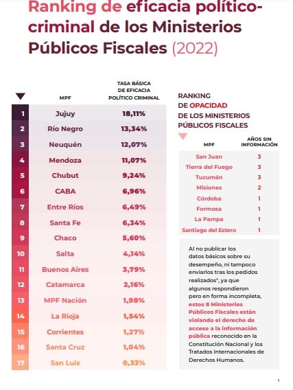 Del documento se desprende que los Ministerios Públicos Fiscales de Tucumán, San Juan, Tierra del Fuego, Misiones, Córdoba, Formosa, La Pampa y Santiago del Estero no enviaron ni siquiera los 4 indicadores más elementales (ingresos, condenas, suspensiones de juicio a prueba y acuerdos reparatorios) que permitirían medir la eficacia básica, pese al plazo de más de 3 meses con el que contaron, y a las reiteradas solicitudes enviadas. Estos datos tampoco son publicados en sus sitios web.