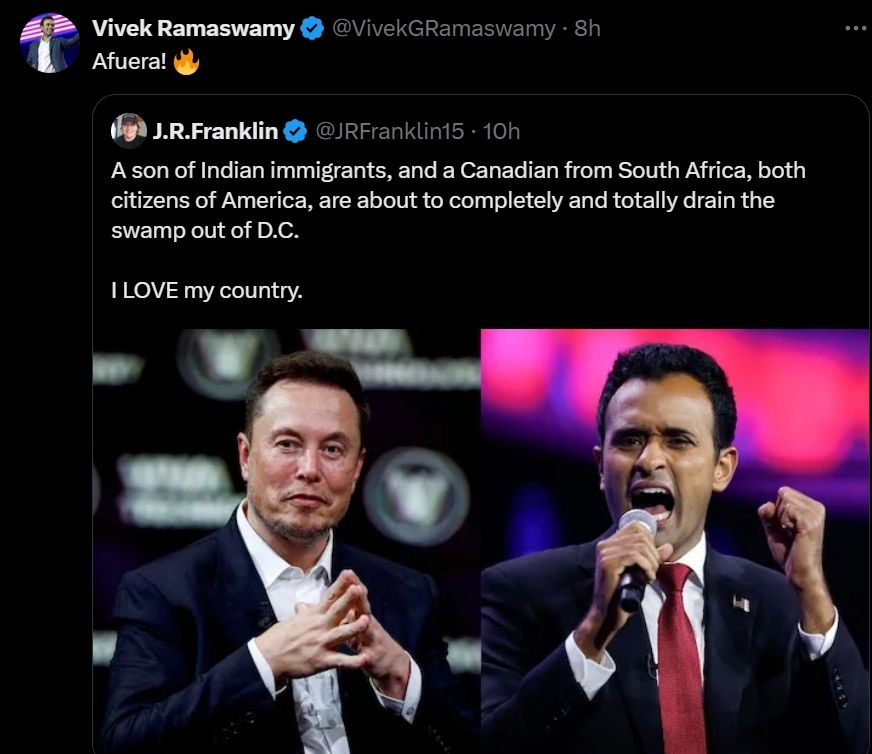 Tras conocerse su nombramiento al frente de DOGE, Ramaswamy anunció que su nuevo organismo "pronto comenzará a recopilar ejemplos de despilfarro, fraude y abuso del gobierno". "Los estadounidenses votaron a favor de una reforma gubernamental drástica y merecen participar en la solución", enfatizó a través de un posteo en X, y arremetió: "No iremos con suavidad, Elon Musk".