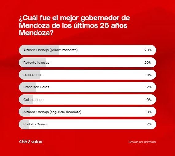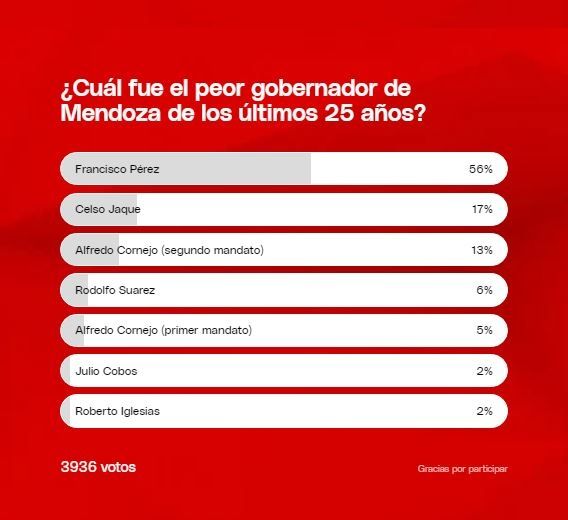 Los valores cambian a la hora de definir cuál consideran los lectores de MDZ como el peor gobernador de los últimos 25 años. Allí sí encabeza la lista por amplio margen Francisco Pérez con el 56% de los votos, seguido por Celso Jaque con el 17%. Pero para el 13% de los encuestados el peor gobernador fue Alfredo Cornejo en su segundo mandato.