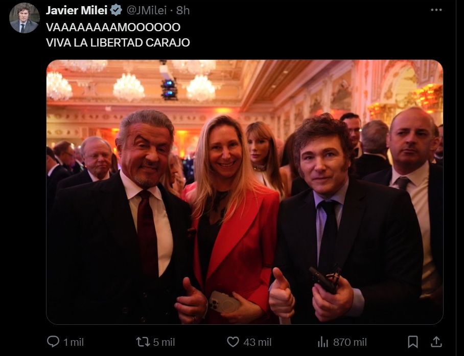 El presidente Javier Milei tuvo este jueves una noche soñada en el evento que encabezó el mandatario electo de Estados Unidos, Donald Trump, en su complejo en Mar-a-Lago, Florida. Allí, no solo intercambió elogios con el republicano, sino que se dio el lujo de conocer a una de las grandes figuras de Hollywood: Sylvester Stallone.