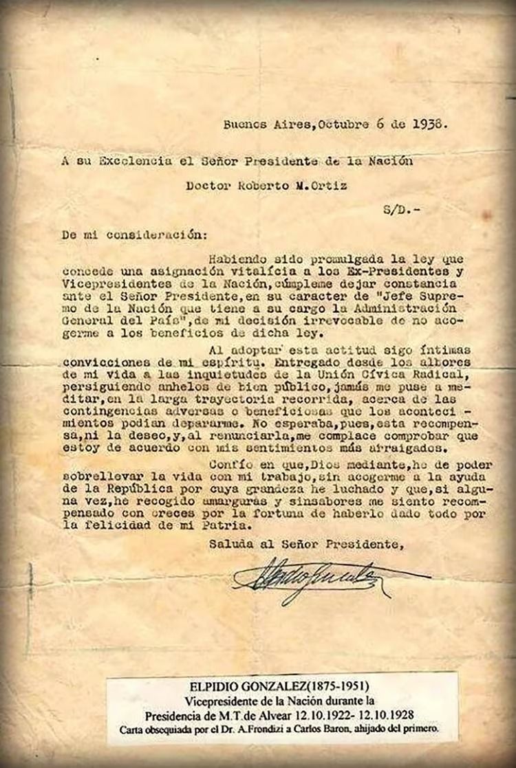 "Habiendo sido promulgada la Ley que concede una asignación vitalicia a los ex Presidentes y Vicepresidentes de la Nación, cúmpleme dejar constancia al señor Presidente, en su carácter de Jefe Supremo de la Nación, que tiene a su cargo la Administración General del País' de mi decisión irrevocable de no acogerme a los beneficios de dicha Ley.