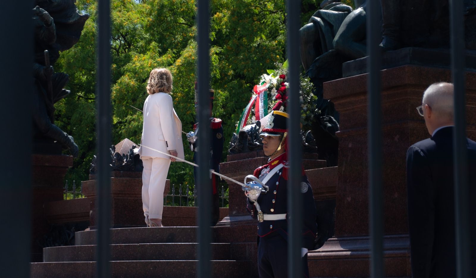 Allí, fue recibida por el canciller Gerardo Werthein y una escuadra de la orquesta del Regimiento de Granaderos a Caballo, que tocó el himno argentino y luego el italiano. También asistió a la ceremonia el embajador de Italia, Fabrizio Lucenti. Bajo las trompetas y los sables de los uniformados, Meloni presentó sus respetos al estratega de Yapeyú, para luego saludar a distancia al grupo de personas reunidas en la plaza.