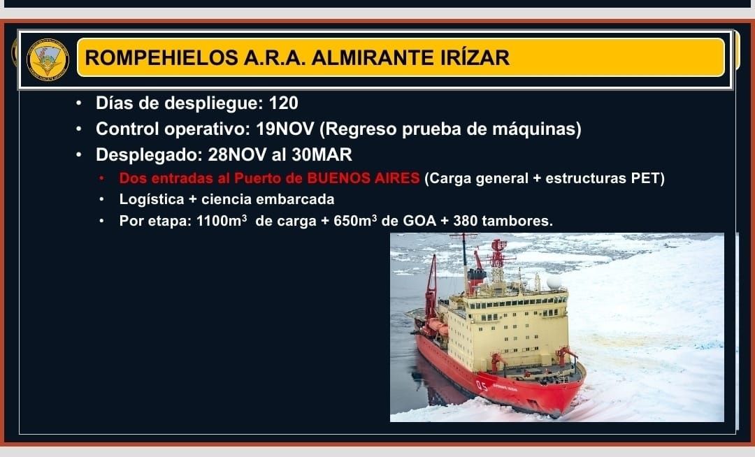 El 19 de noviembre finalizó la puesta a punto y prueba de máquinas del rompehielos ARA Almirante Irizar y se alista a zapar el 28 de noviembre con el grueso de los pertrechos más el combustible para funcionamiento de las bases.