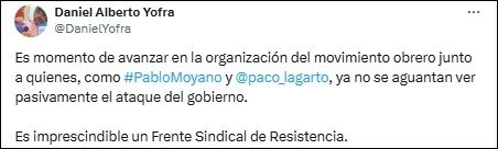 "Es momento de avanzar en la organización del movimiento obrero junto a quienes, como Pablo Moyano y Paco Manrique, ya no se aguantan ver pasivamente el ataque del Gobierno. Es imprescindible un Frente Sindical de Resistencia", sostuvo este sábado en su cuenta de X el titular del sindicato de Aceiteros, Daniel Yofra.