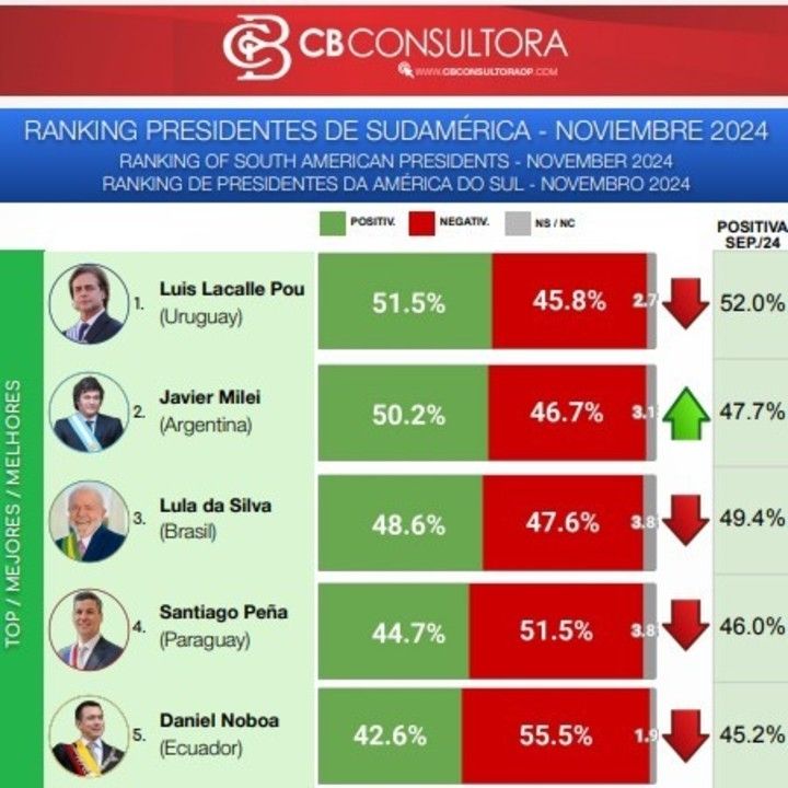 En lo más alto del ránking se destacan los presidentes Luis Lacalle Pou y Javier Milei. El presidente uruguayo, quien ya lideraba la tabla en octubre, se mantiene en la cima con una valoración positiva de 51,5%, aunque experimentó una ligera caída de medio punto en comparación con el mes anterior. Su nivel de rechazo es del 45,8%.