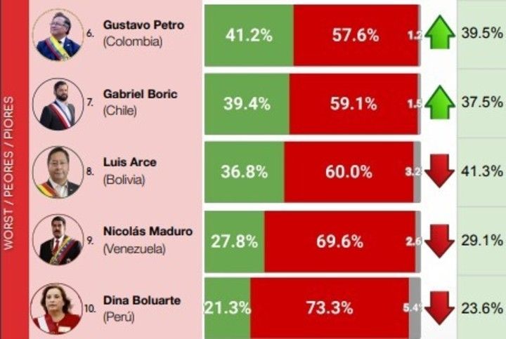 Así, en la parte baja del ránking, Dina Boluarte y Nicolás Maduro siguen siendo los presidentes con las peores cifras de aprobación en Sudamérica, mientras que Arce, Boric y Petro presentan variaciones más moderadas en sus índices de popularidad.