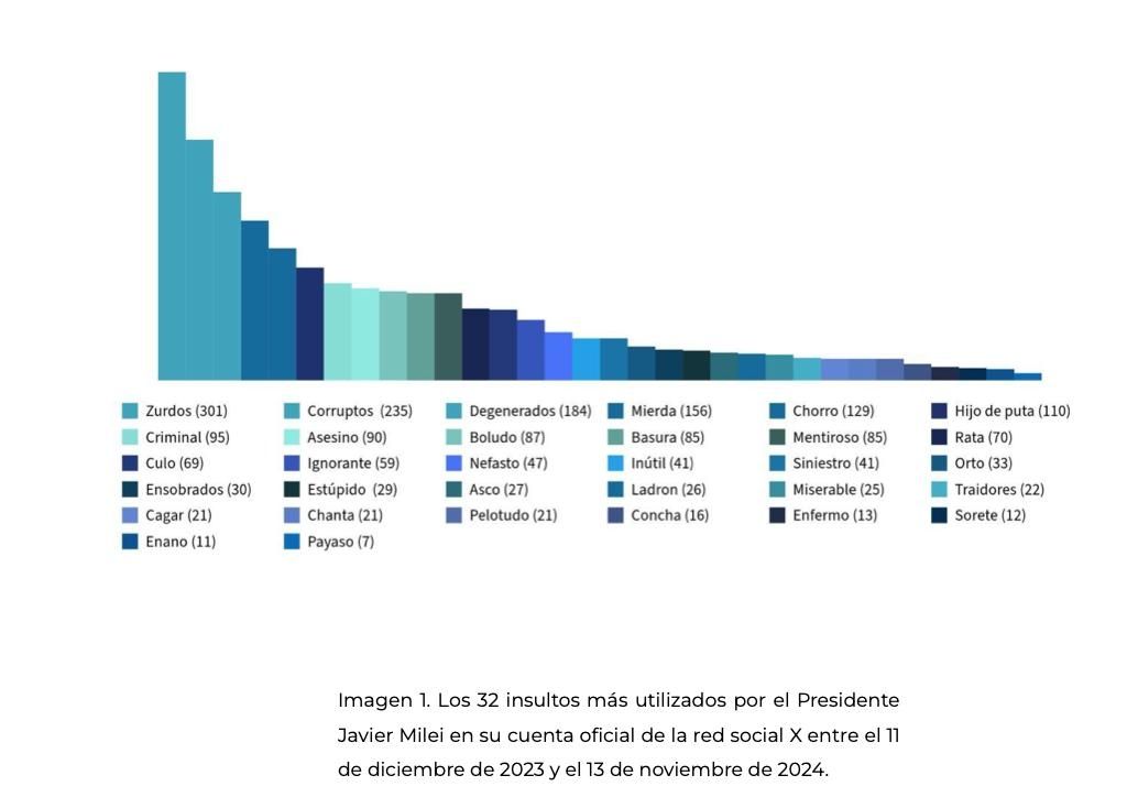 En este contexto, añadió: "Comparto el informe que hemos elaborado desde el Movimiento al Desarrollo acerca de los efectos de su violencia discursiva y sus insultos sobre la convivencia democrática. Desde que asumió la presidencia de la nación, usted ha utilizado 32 términos para insultar y descalificar a personas e instituciones… ¡en 2.173 oportunidades! solo a través de su cuenta en la red social X".