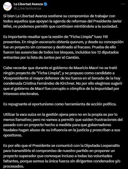 "Si bien La Libertad Avanza sostiene su compromiso de trabajar con todos aquellos que apoyan la agenda de reformas del Presidente Javier Milei, no podemos permitir que continúen mintiéndole a la sociedad. Es importante resaltar que la sesión de 'Ficha Limpia' tuvo 116 presentes. En ningún escenario obtenía quórum, y desde su concepción fue un proyecto sin consenso y destinado al fracaso", dice el comunicado emitido desde La Libertad Avanza como respuesta a las críticas del PRO.