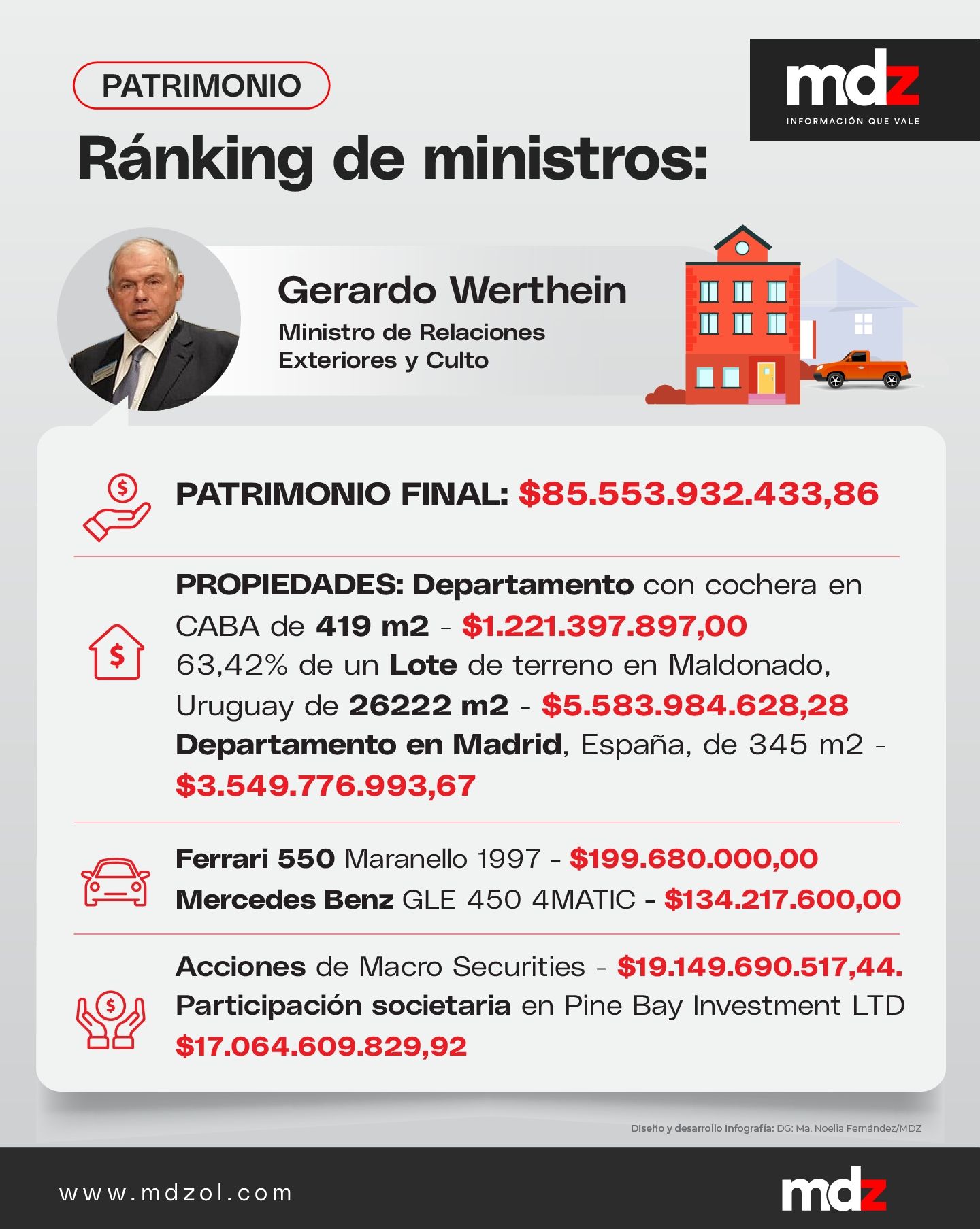Entre sus principales bienes, Werthein posee un departamento en la Ciudad de Buenos Aires de 419m2 por un valor de $1.221.397.897 y 5 propiedades en el exterior, entre ellas, un departamento de 345m2 en Madrid y otro de 299m2 en Punta del Este. El ministro posee 3 autos, una Ferrari de casi $200 millones, un BMW y un Mercedes Benz, este último en el exterior. Además, declaró 11 cuentas en el exterior -sin aclarar dónde- que dan cuenta de alrededor de casi $4 mil millones. Eso sin contar sus participaciones societarias, tanto en el país como fuera de él. La mayor de ellas alcanza cerca de $20 mil millones colocados en acciones de Macro Securities.