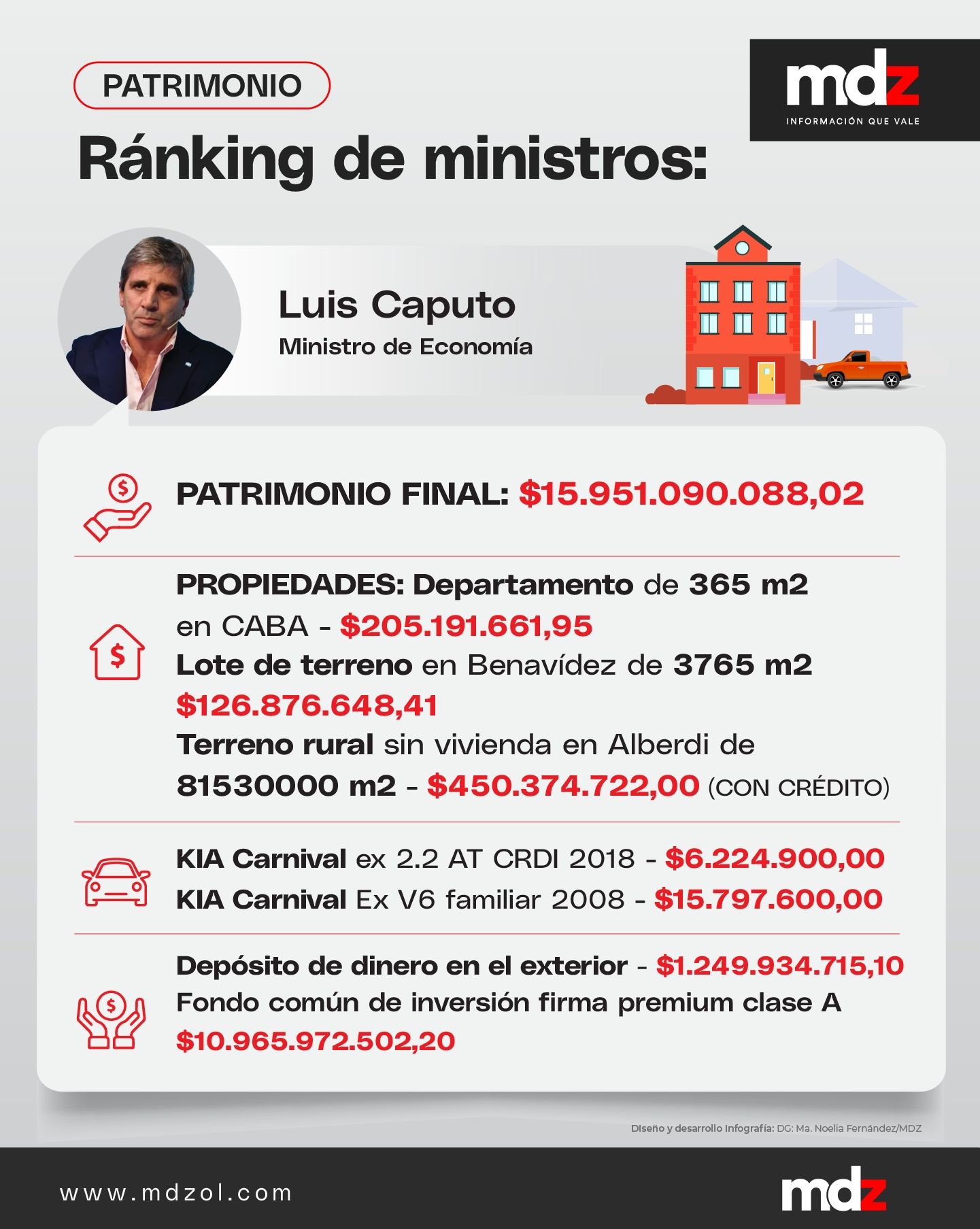 Le siguen en el Top 3 el ministro de Economía, Luis Caputo, que metió un año de crecimiento récord: pasó de 4 a 18,9 millones de dólares, casi 16 mil millones de pesos. Casi la totalidad del crecimiento patrimonial del funcionario se debe a la aparición de un fondo común de inversión (Fima Premium Clase A) de $10.965.972.502,20 (casi once mil millones de pesos) que no figuraba en su declaración anterior.