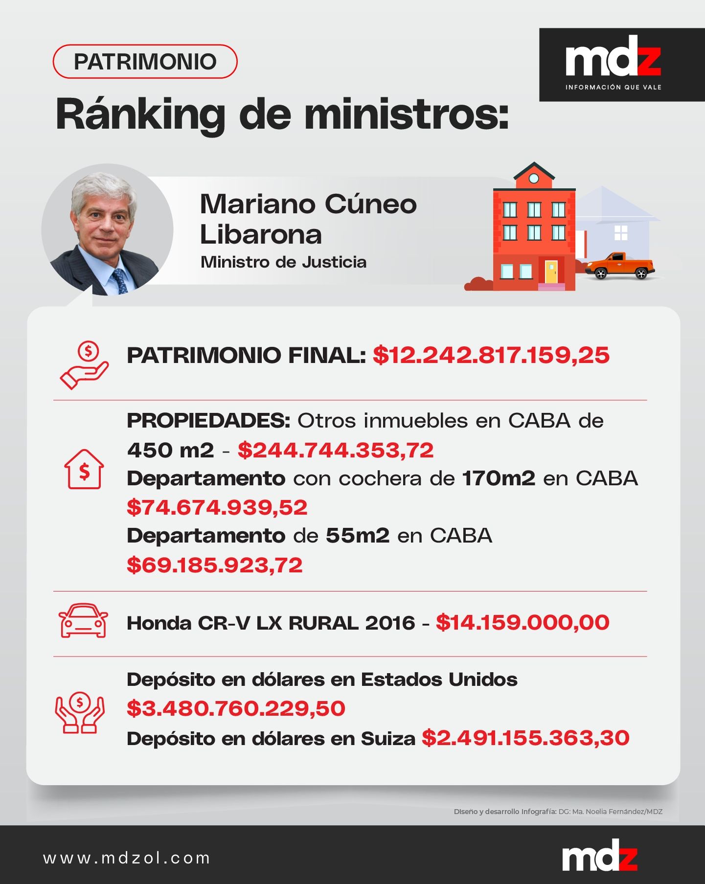 Cierra la tríada más acaudalada del Gobierno el ministro de Justicia, Mariano Cúneo Libarona, que declaró un patrimonio de $12.242.817.159,25, alrededor de 14 millones y medio de dólares (siempre calculando en función del valor oficial al último día hábil de 2023). La fortuna del abogado se apoya en 27 inmuebles en el país y dos en el exterior, sumado a cuentas en el extranjero declaradas en Suiza, Puerto Rico, Estados Unidos y Uruguay. Las cuatro suman poco menos de US$14 millones, casi la totalidad de su patrimonio.