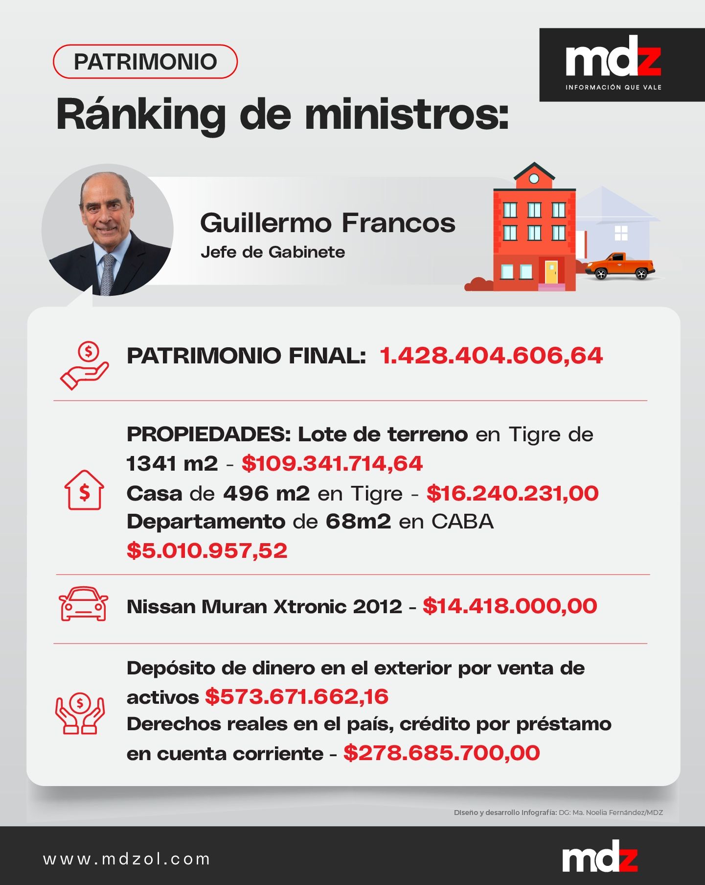 Llegado su turno, el jefe de Gabinete declaró un patrimonio de $1.428.404.606,64, un 371% más que los $303.166.280,71 informados al comienzo de 2023. Entre sus bienes, Francos enumeró 5 inmuebles, entre ellos un lote de terreno en Tigre de 1341 m2 ($109.341.714,64), una casa de 496m2 en ese mismo municipio bonaerense ($16.240.231 y un departamento de 68m2 en CABA ($5.010.957,52). A su vez, el exministro del Interior posee un Nissa Muran Xtronic 2012 valuado en $14.418.000,00.