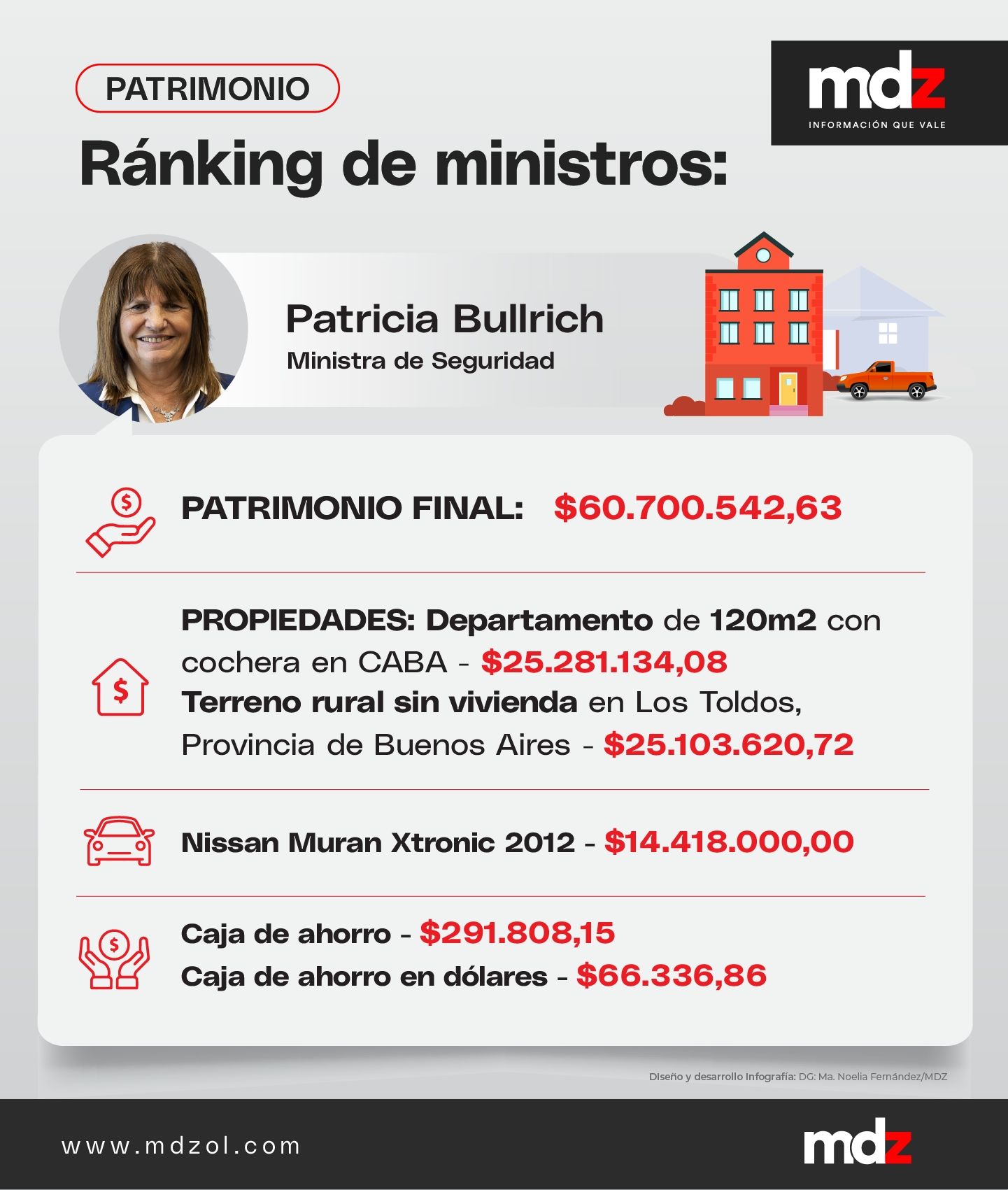 La expresidenciable de Juntos por el Cambio declaró un patrimonio de $60.700.542,63, lo que representa un aumento del 35% respecto al inicio de 2023. La ministra de Seguridad anotó en su presentación un departamento de 120m2 con cochera en CABA ($25.281.134,08) y un terreno rural sin vivienda en Los Toldos, Provincia de Buenos Aires ($25.103.620,72), un monto menor a los funcionarios que la precedieron. Según su declaración, Bullrich maneja un Ford Eco Sport Titanium 2013, del cual es dueña en un 50%. Esos bienes representan casi la totalidad de su patrimonio, ya que después declaró solo 3 cuentas en el país en pesos por cerca de $450 mil, además de otros $200 mil en efectivo y una austera caja de ahorro en dólares con 82 billetes norteamericanos.