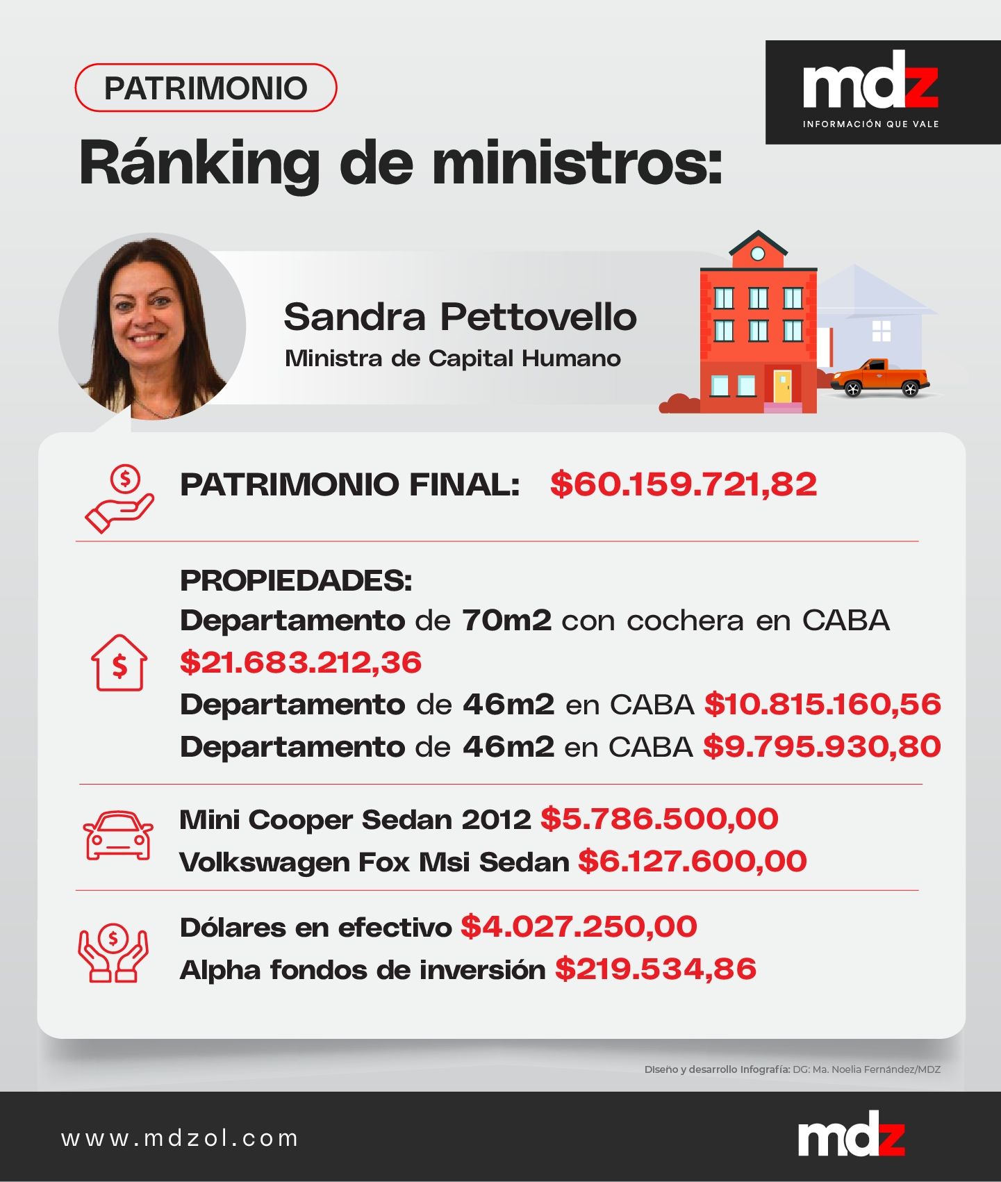 Pettovello está apenas por debajo de Bullrich con un patrimonio declarado de $60.159.721,82, lo que representó un crecimiento del 229,5%. Esto es 18,1 puntos porcentuales por encima de la inflación de 2023. Entre sus bienes, la ministra declaró 3 departamentos en la Ciudad de Buenos Aires, una cochera y dos autos (un Mini Cooper Sedan 2012 y un Volkswagen Fox MSI 2017), lo cual explica casi la totalidad de su presentación. A eso se suman 5 mil dólares en efectivo, entre otras cuentas menores en pesos.