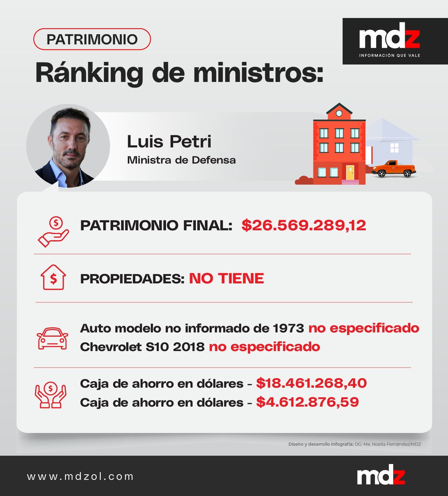 En contraposición, el más "terrenal" de los miembros del Gabinete es el ministro de Defensa, Luis Petri, que declaró un patrimonio de 26 millones de pesos. Dijo no tener propiedades a su nombre y sus principales fondos están divididos en dos cajas de ahorro en dólares.