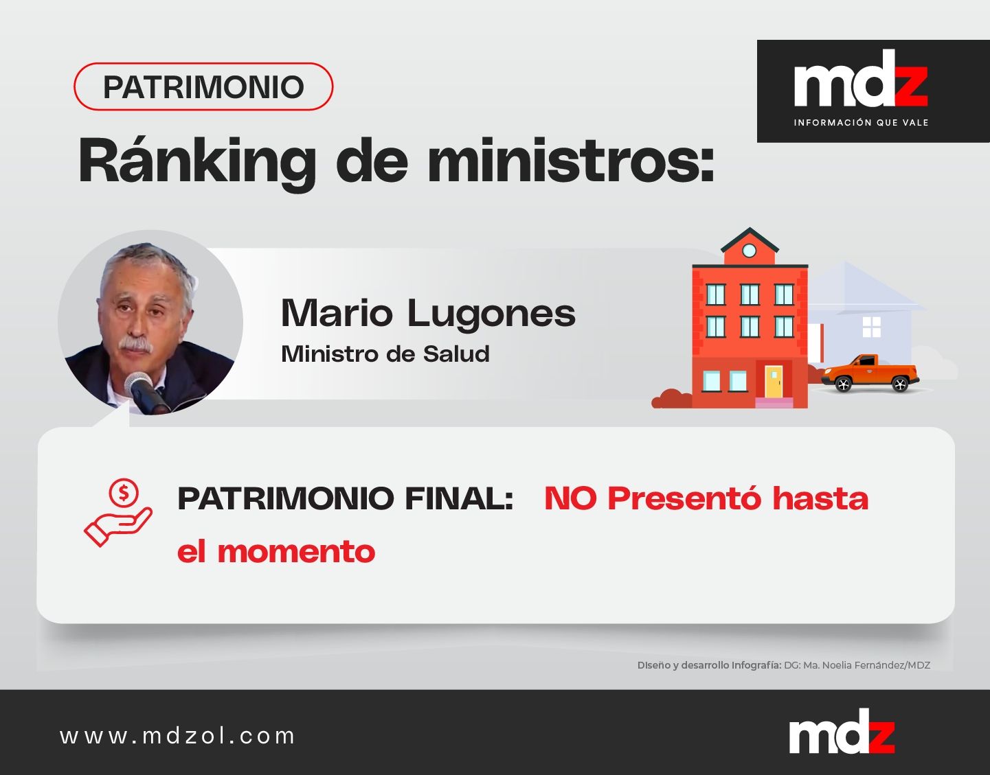 El reemplazante de Mario Russo en la cartera de Salud fue el único miembro del Gabinete que no presentó su declaración jurada al momento del cierre, ni la final ni la inicial, por lo que su patrimonio es una incógnita. Sin embargo, Lugones es el fundador y presidente de Silver Cross America Inc., propietaria del Sanatorio Güemes, por lo que difícilmente podría ocupar el último lugar de este ránking.