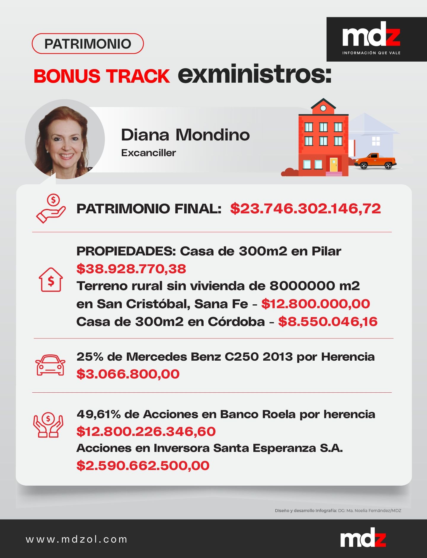 El último enroque en el Ministerio de Relaciones Exteriores, Comercio internacional y Culto que implicó la salida de Diana Mondino y la llegada de Gerardo Werthein mantuvo el primer puesto del ránking patrimonial dentro de la Cancillería. Hasta su despedida, la heredera del Banco Roela era la funcionaria del Gabinete con mayores ingresos con un haber de $23.746.302.146,72. Para mantener la costumbre, su sucesor desembarcó en la función pública con un patrimonio declarado de $85.553.932.433,86, más de 101 millones de dólares.