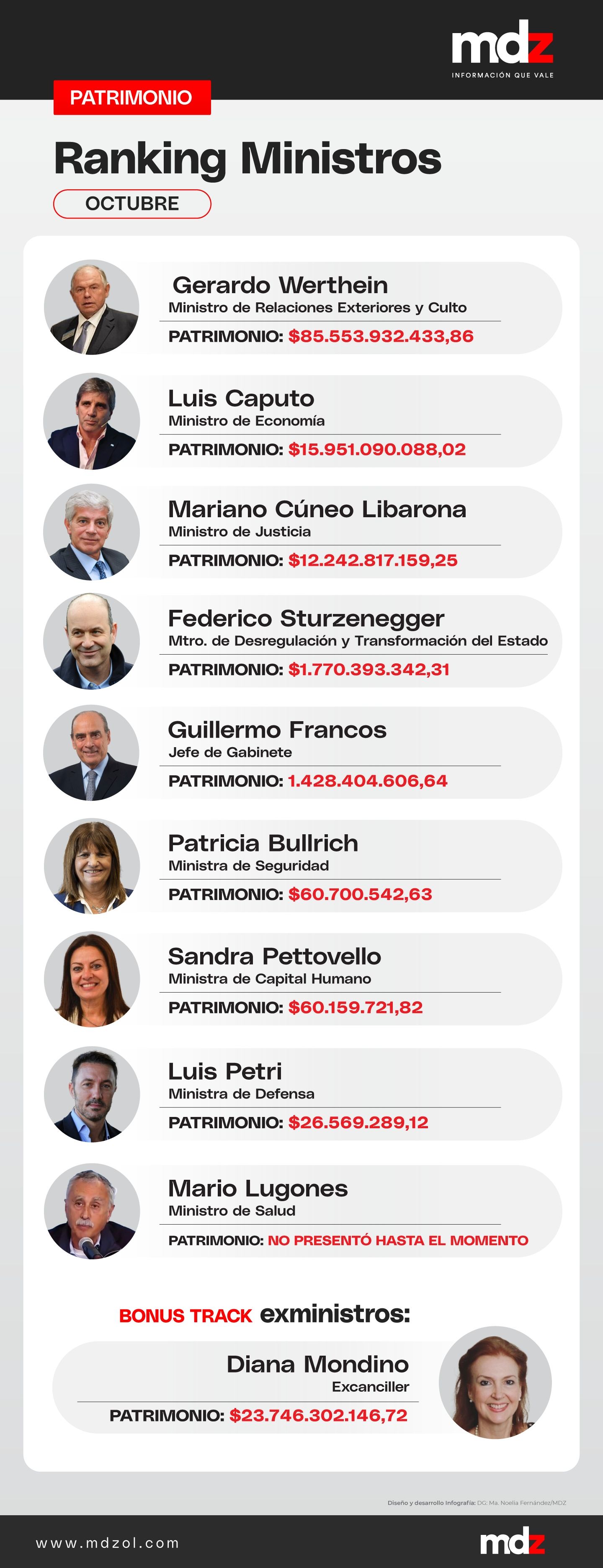 Tal como establece la Ley 25.188, los funcionarios del Gobierno tenían tiempo hasta el pasado jueves 31 de octubre para presentar su declaración jurada correspondiente a 2023. Los documentos recopilados por MDZ revelaron quiénes son los ministros más adinerados del Gabinete y cómo evolucionó su patrimonio durante el año pasado, es decir, antes de asumir en la función pública.
